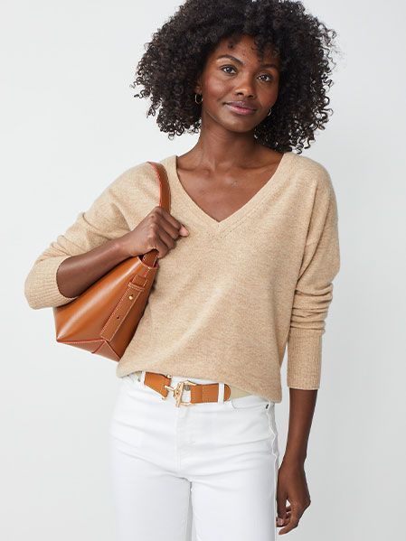No matter where you travel, a cashmere sweater or wrap belongs in your carry-on, perfect prepared for airplane air-conditioning or shifting between climates. Wondering what to wear under a cashmere sweater? Layer a fitted tee under our Glynn V-Neck or a linen shirt under our Dina turtleneck.